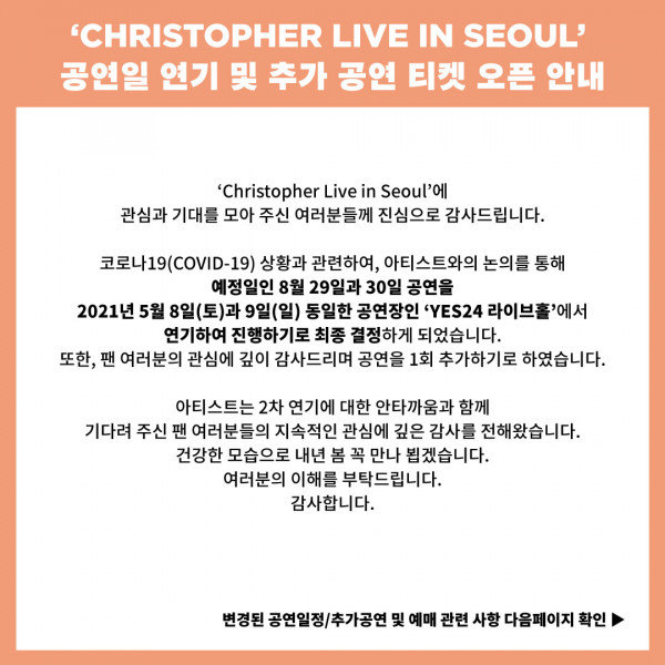 [‘Christopher Live in Seoul’ 공연일 연기 및 추가 공연 티켓 오픈 안내]
